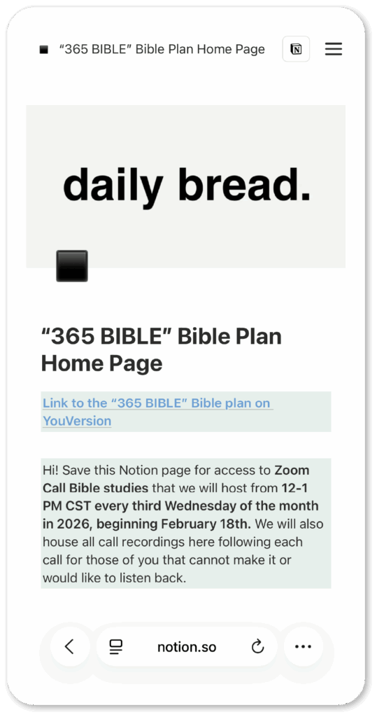 Gather with our community on Zoom every third Wednesday of the month in 2026 from 12–1 PM CST. Access the call link, schedule, and all recordings on the Bible Plan home page.